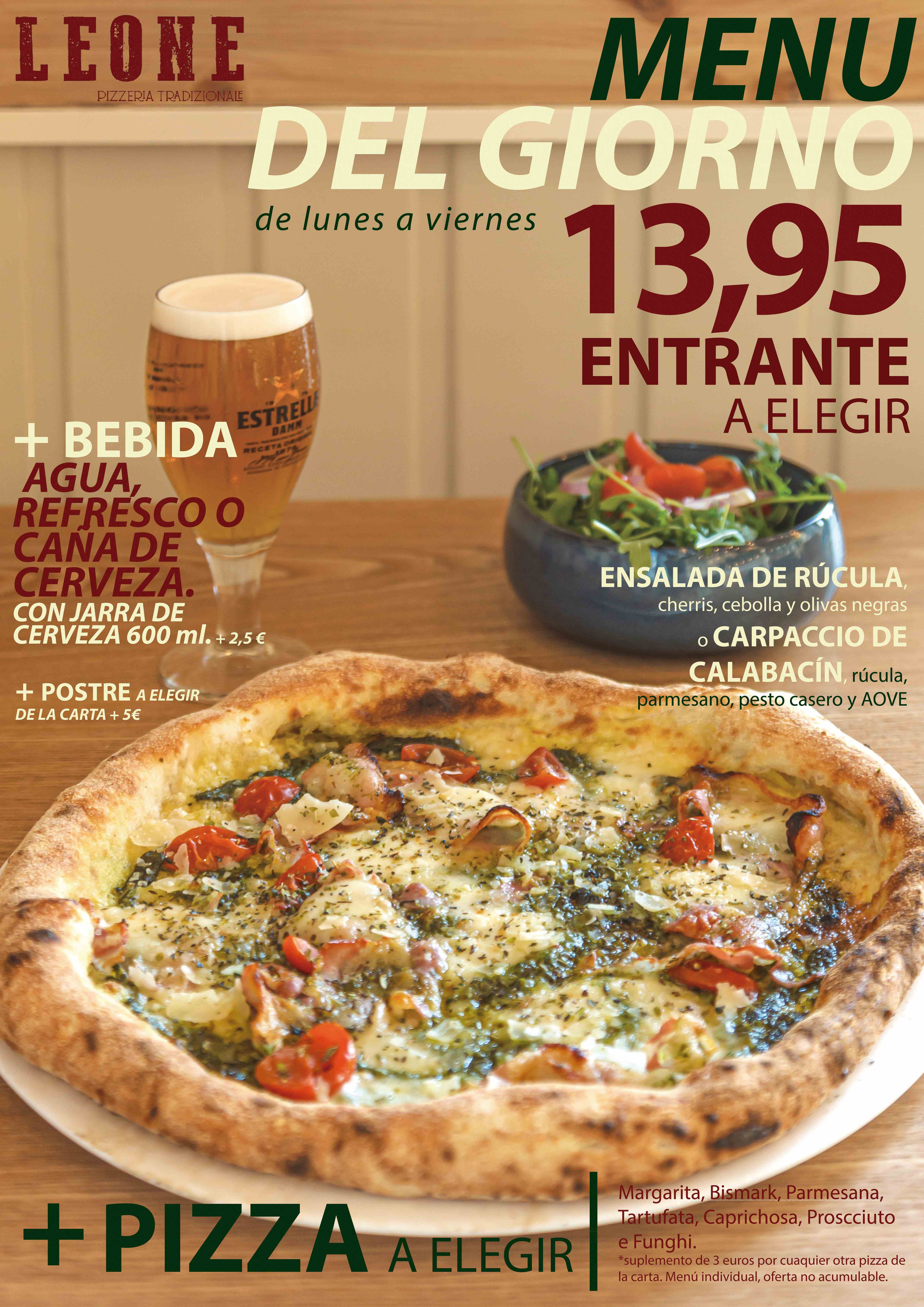 Disfruta en Leone del mejor sabor de Italia con el Menú de LUNES A VIERNES Del Giorno por 13,95€ también este domingo.